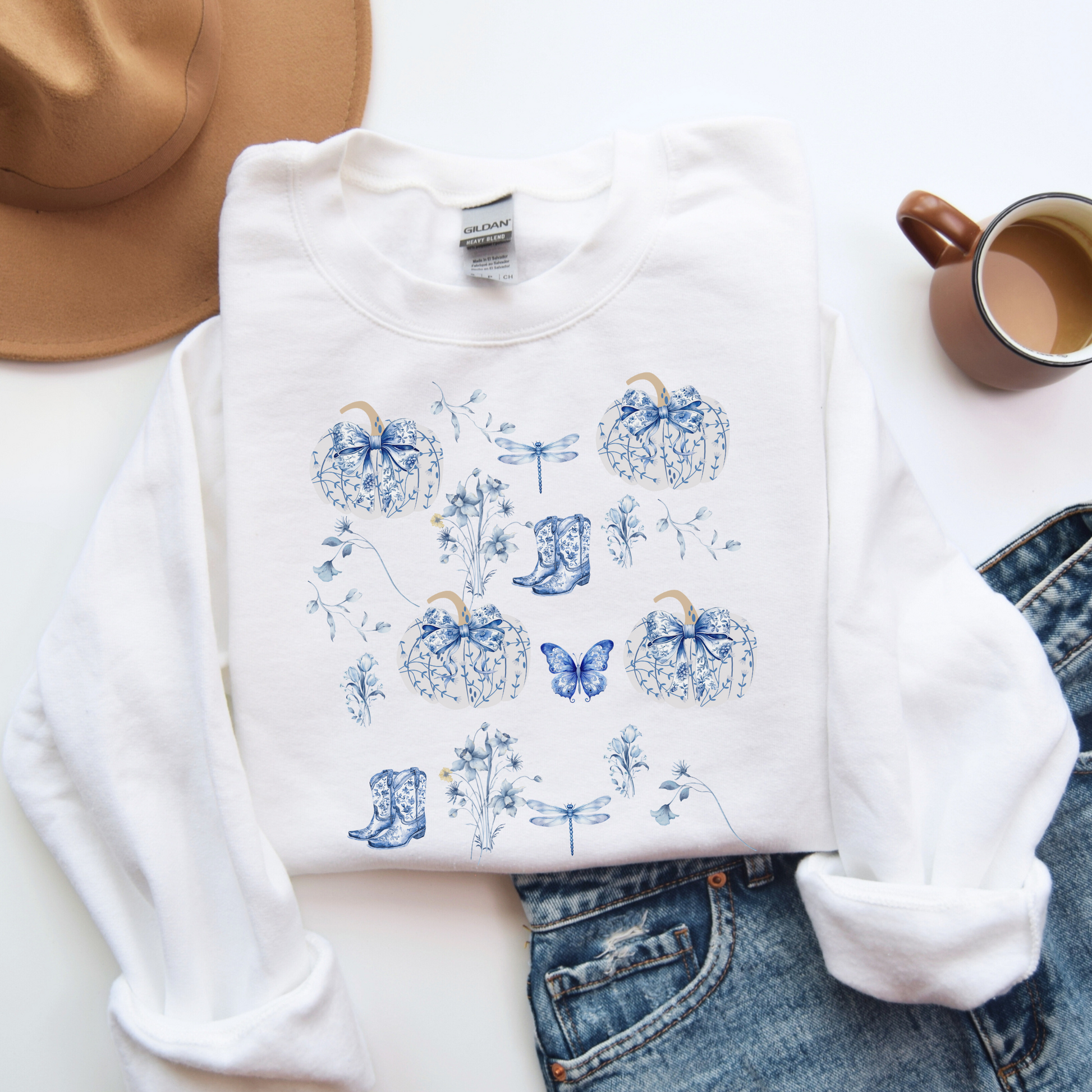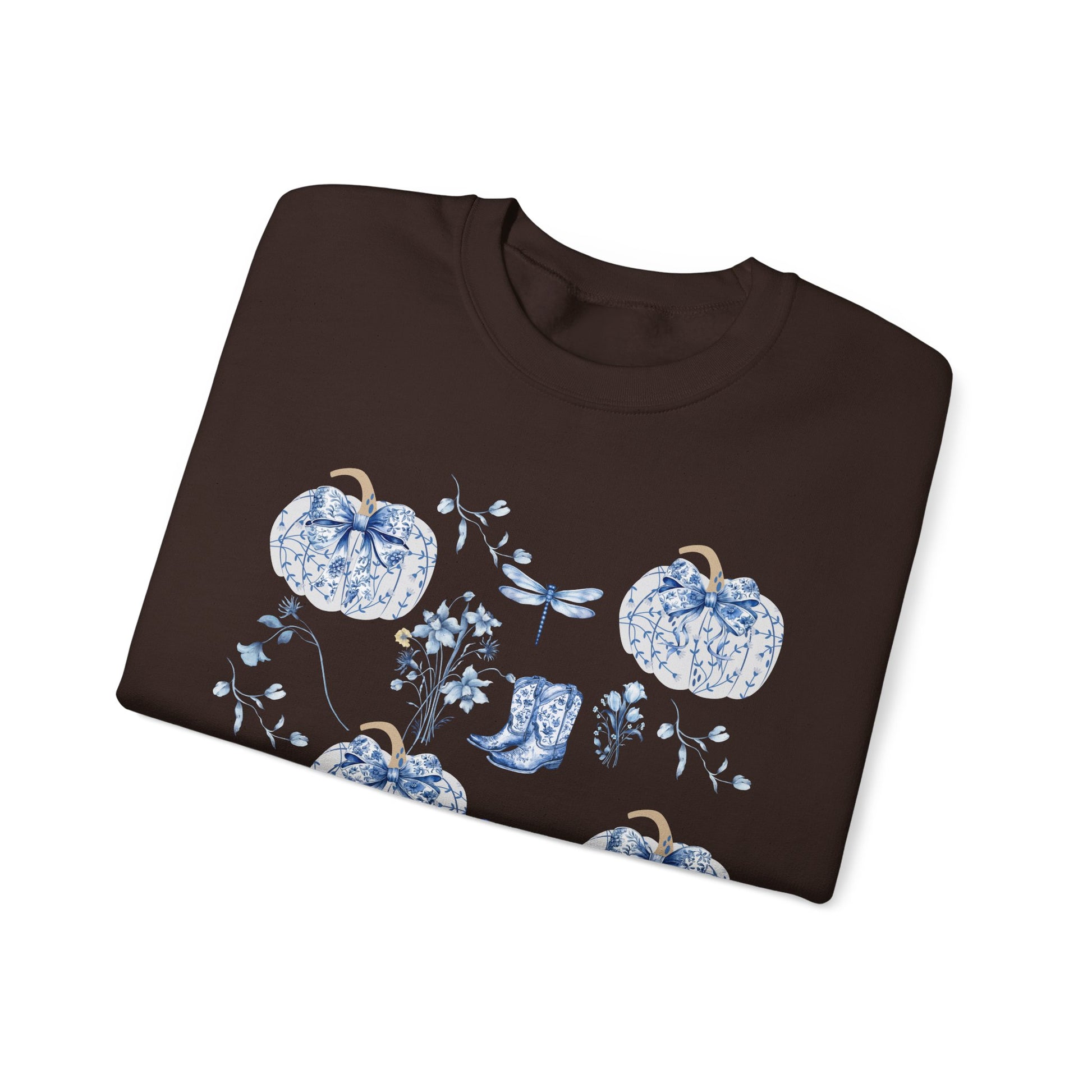Embrace the cozy comfort of this Unisex Heavy Blend™ Crewneck Sweatshirt, perfect for cooler days. Featuring a delightful design with intricate blue pumpkins, butterflies, and flowers, this sweatshirt radiates an artistic vibe that effortlessly elevates any casual outfit. It's the ideal wardrobe piece for those who appreciate unique, eye-catching fashion. Whether you're lounging at home, running errands, or enjoying a fall gathering, this sweatshirt combines style with warmth, making it a versatile addition to your closet.