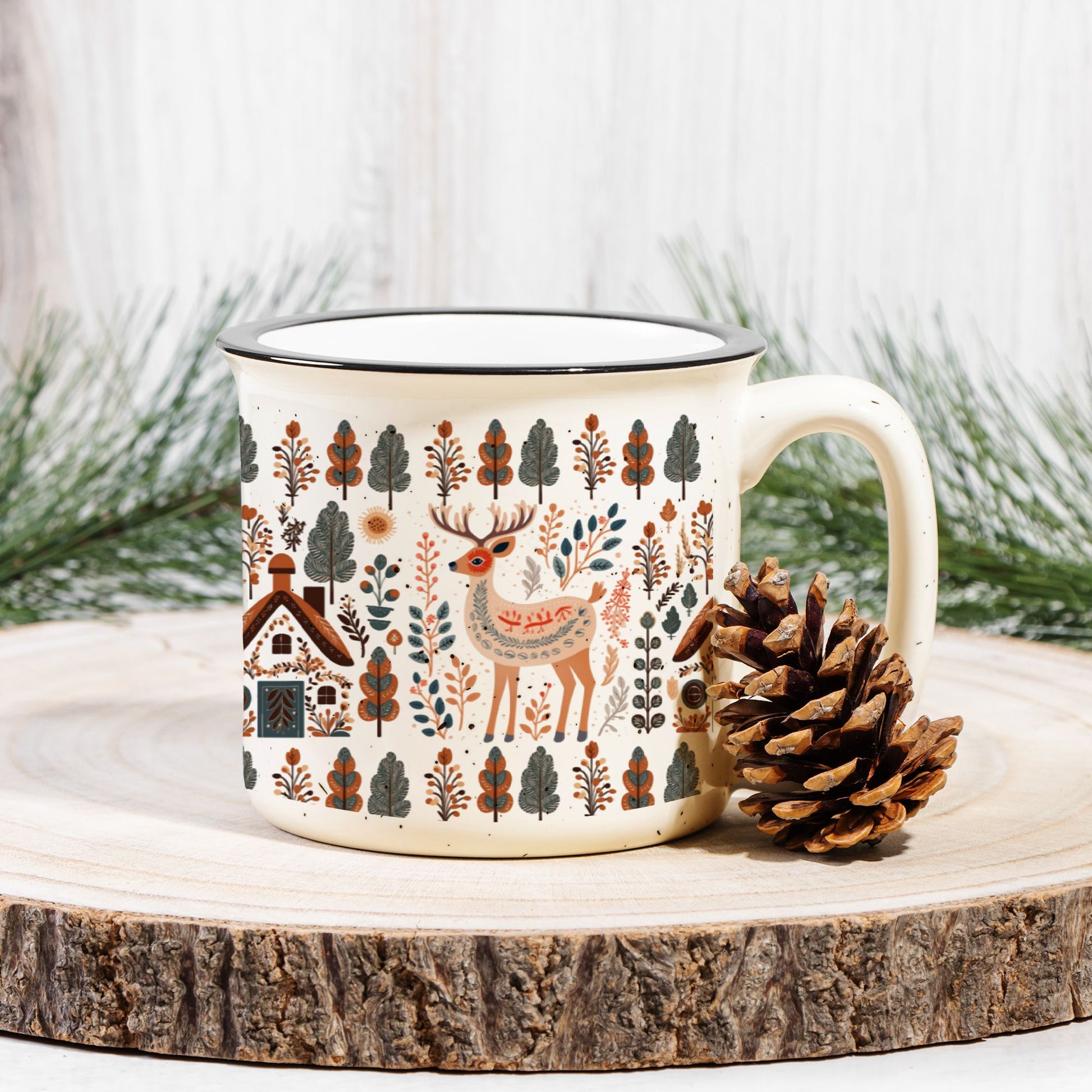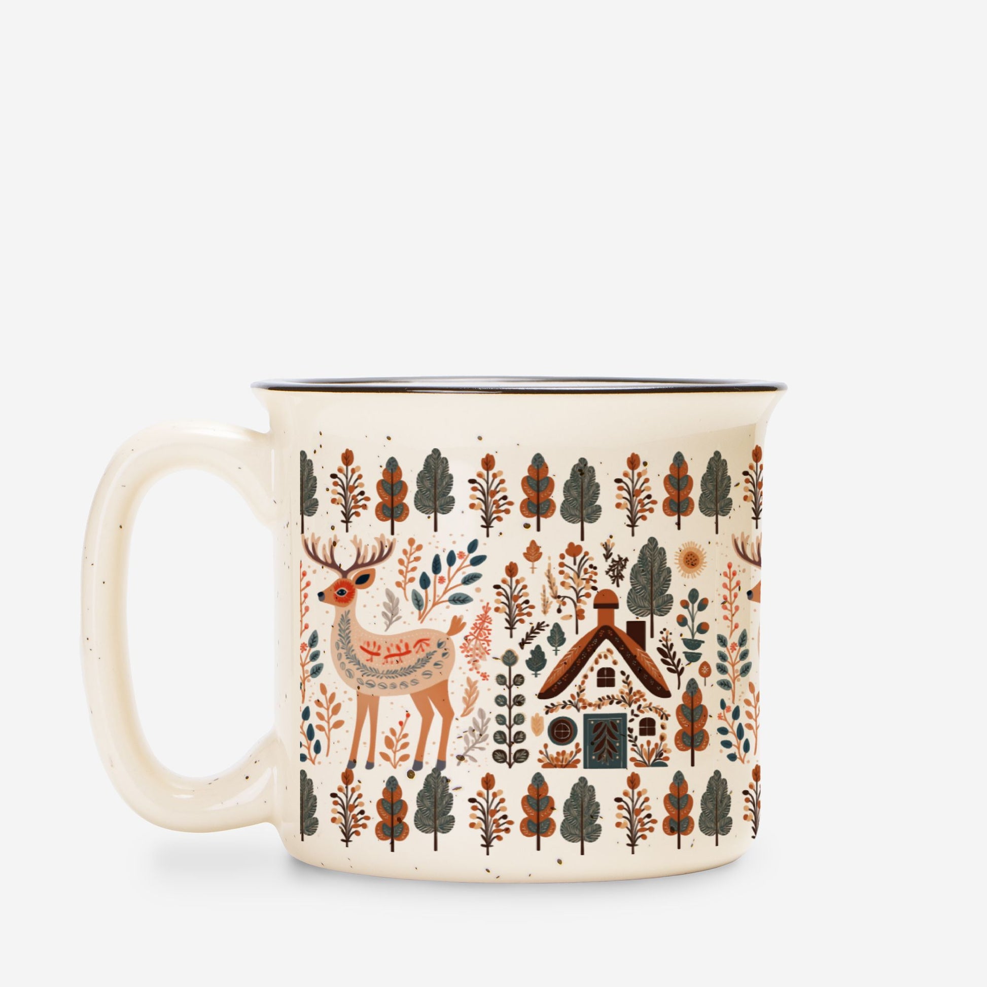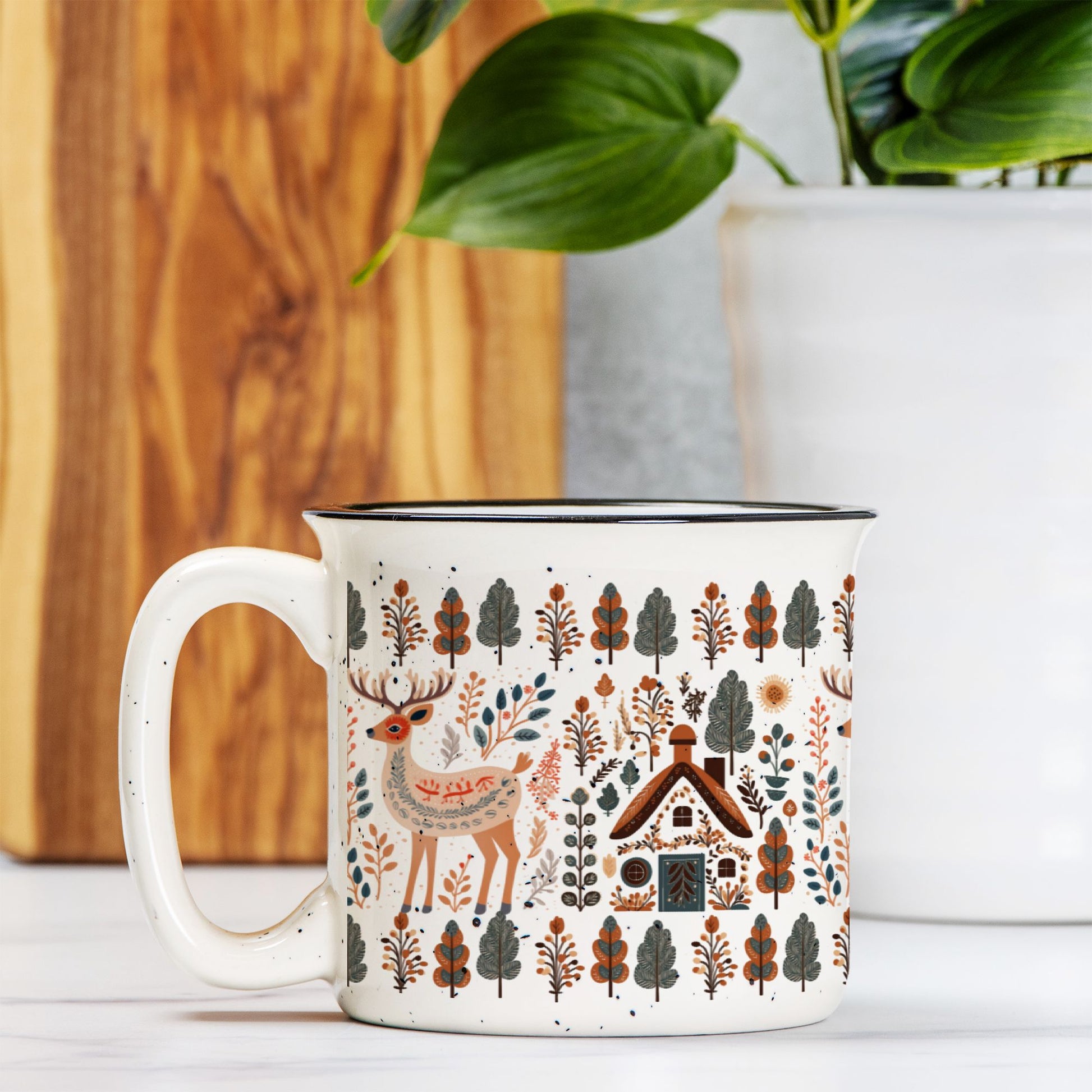 Deer Mountain Trees Mug Camping lover Scandinavian Folk Art design