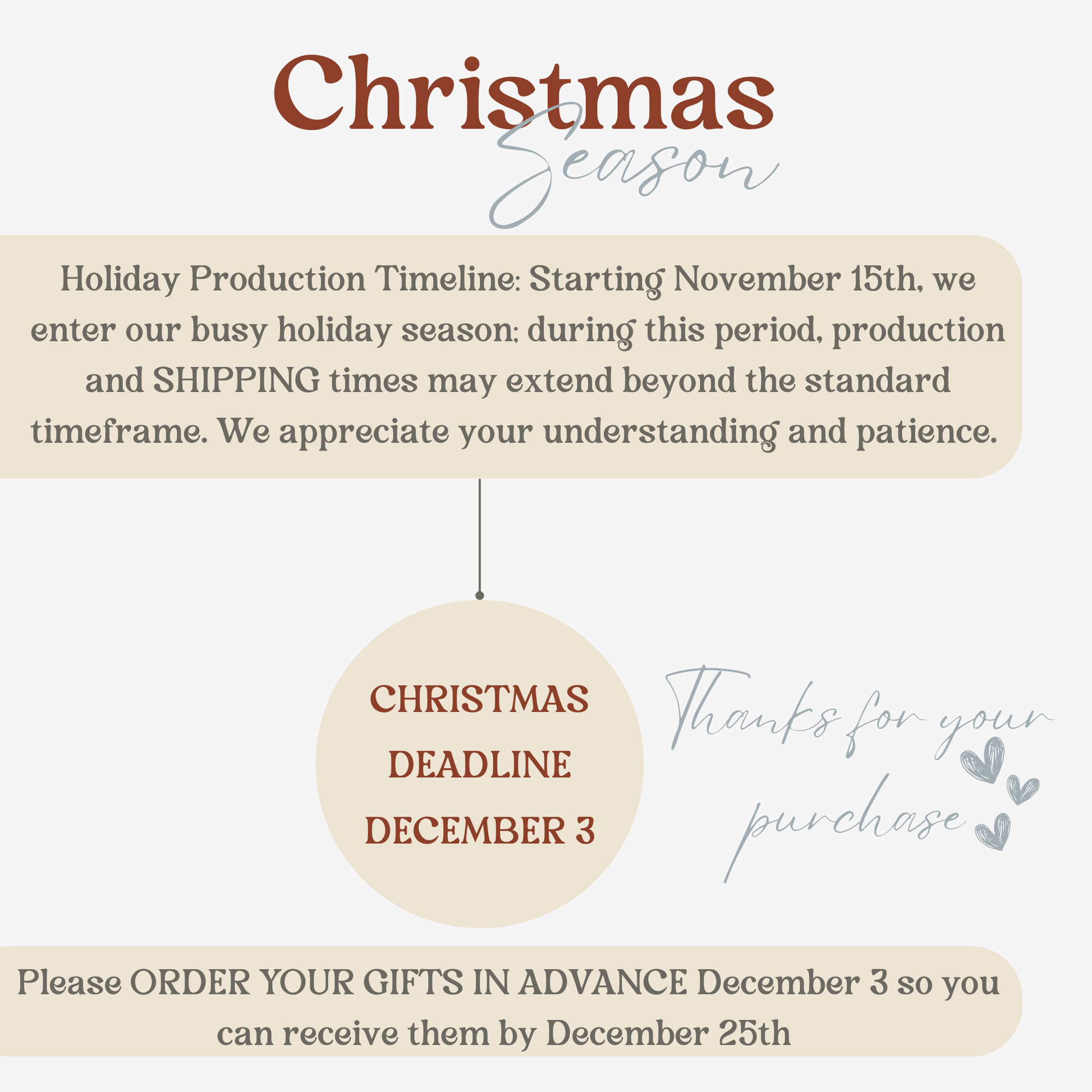 Custom orders typically take 3-5 business days to produce before shipping. During Holiday Season can be extended.