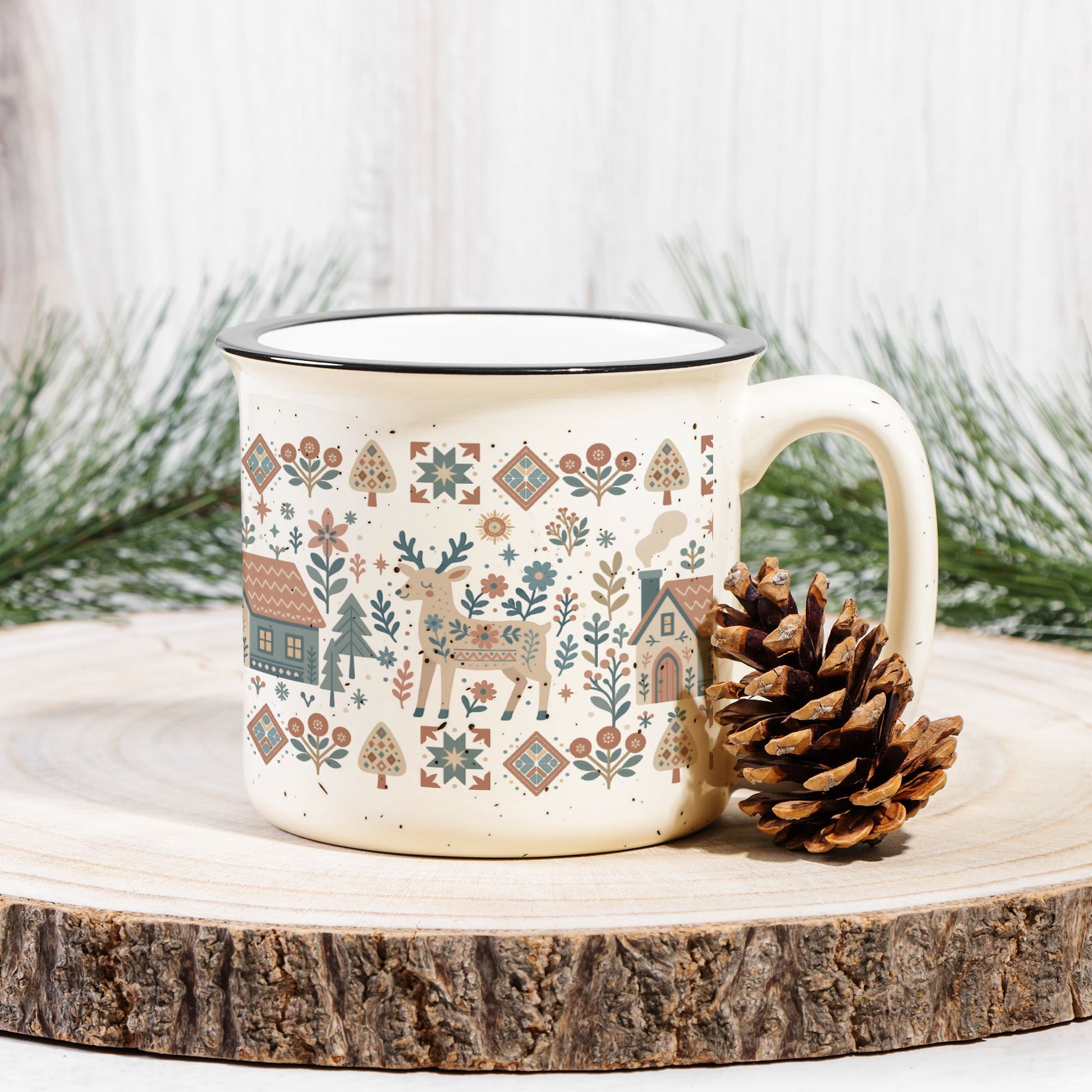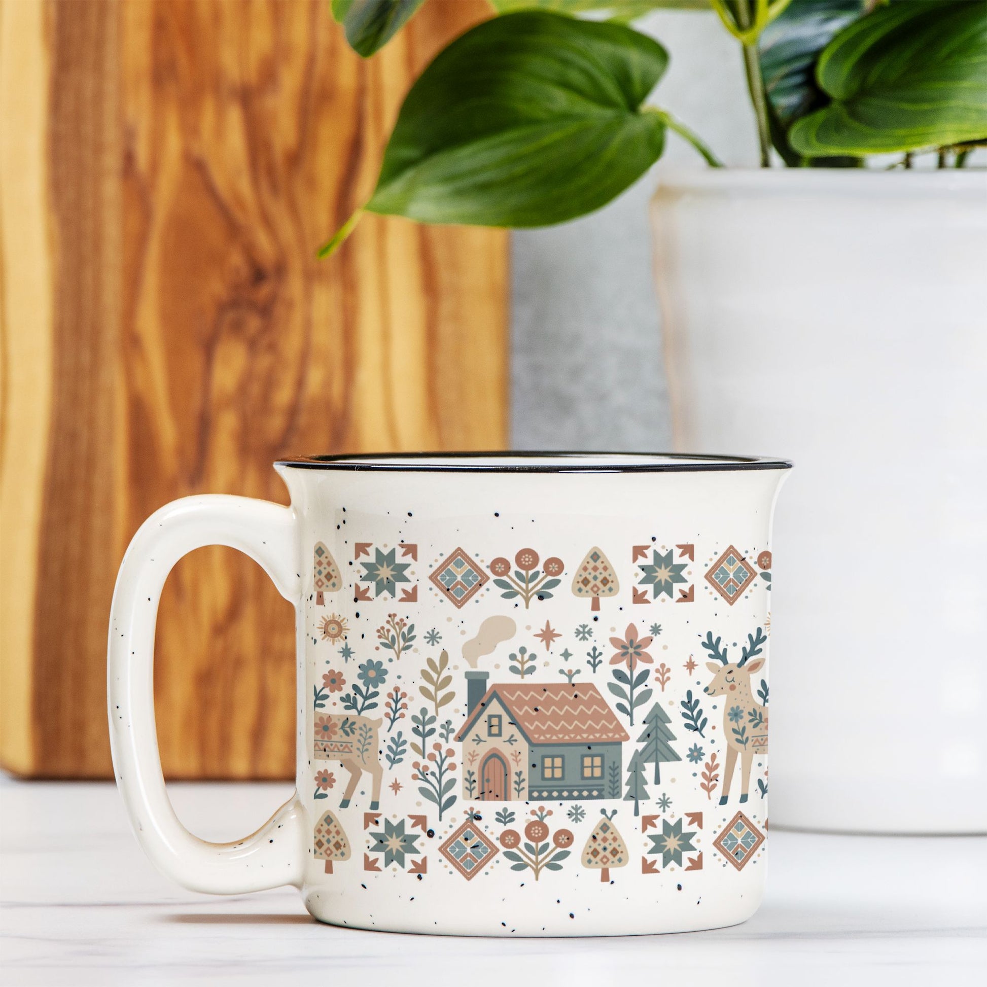Embrace the warmth of winter with our Ceramic Camp Mug Speckled Cream 13oz, a charming blend of durability and style crafted for your outdoor adventures and cozy evenings alike. Adorned with a delightful deer and a quaint cabin in a Nordic folk art design, this heavy-duty, speckled mug invites you to savor your favorite hot cocoa or rich hot chocolate while nestled by the fire or wrapped in a blanket at home. A thoughtful thank you gift for family and friends.