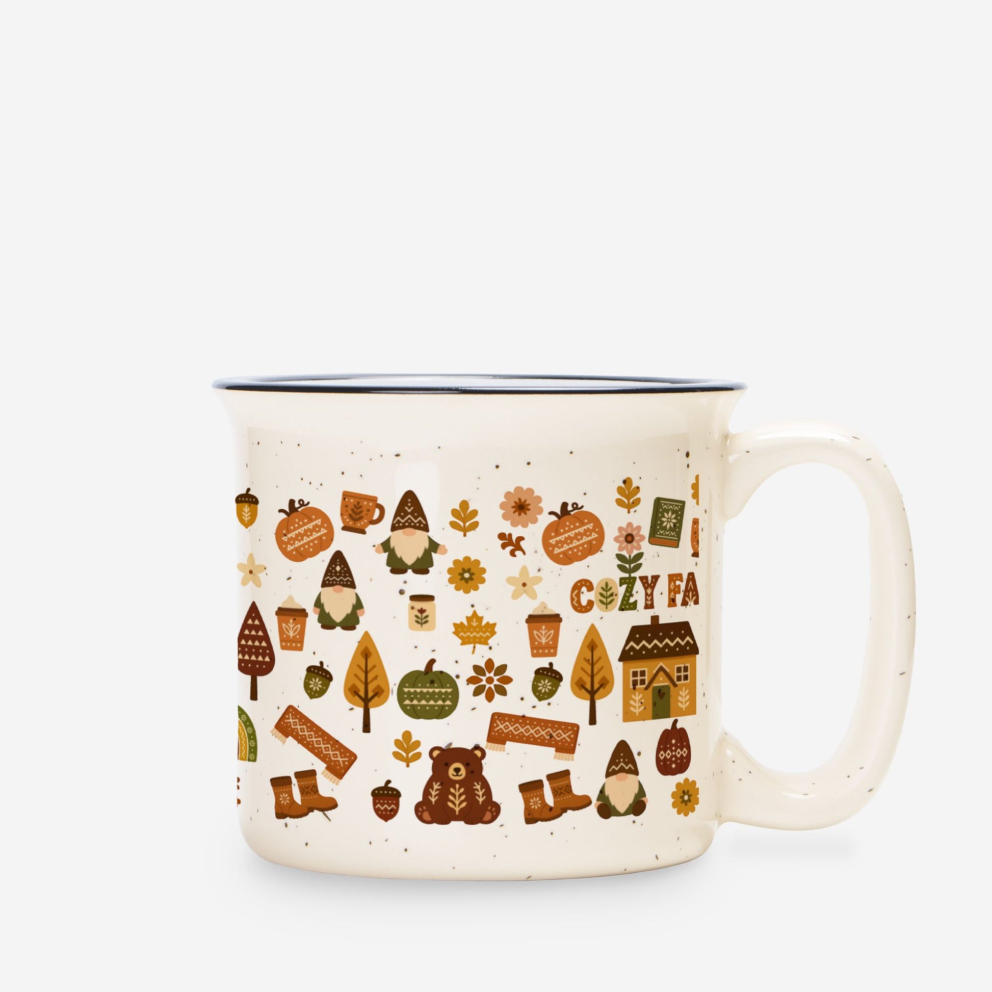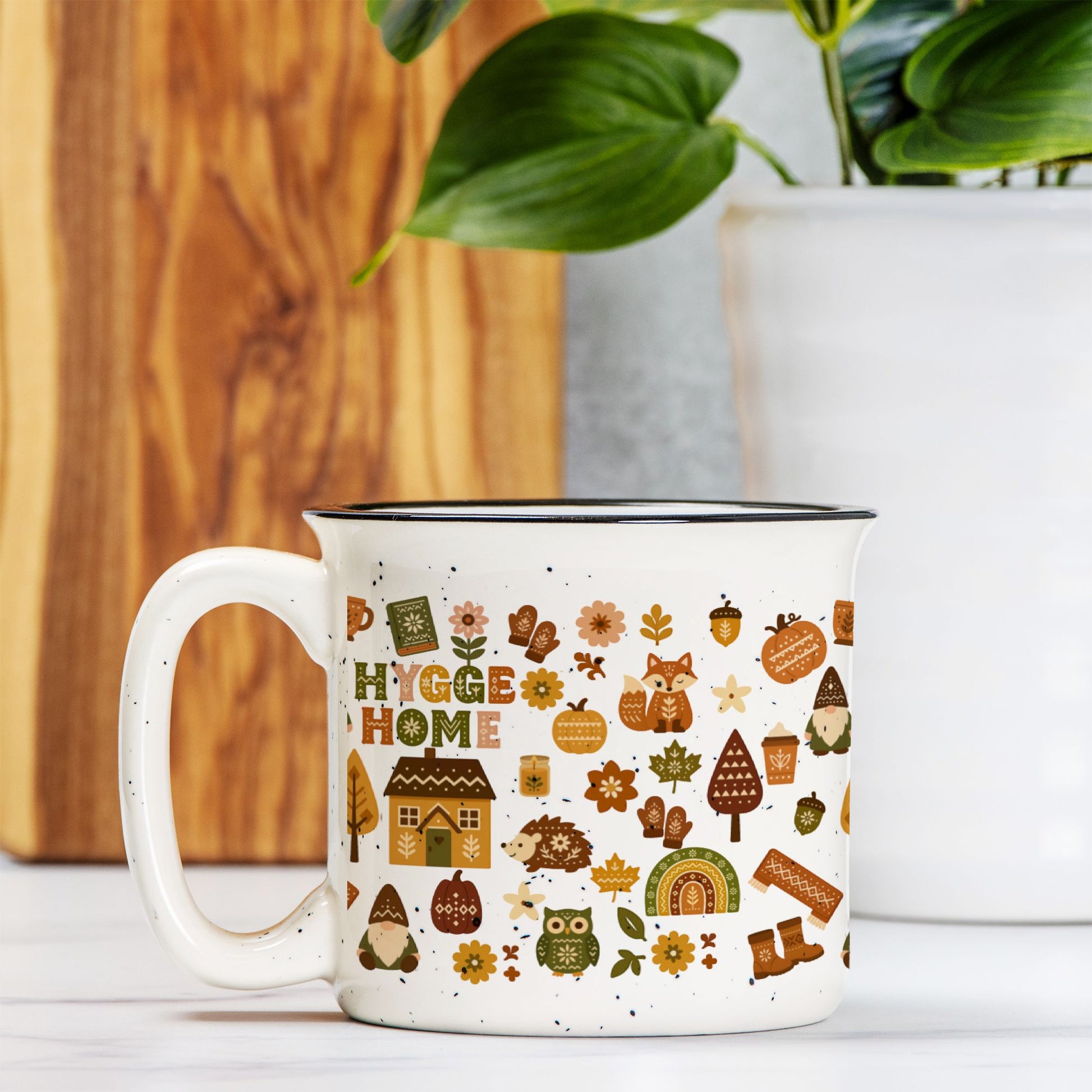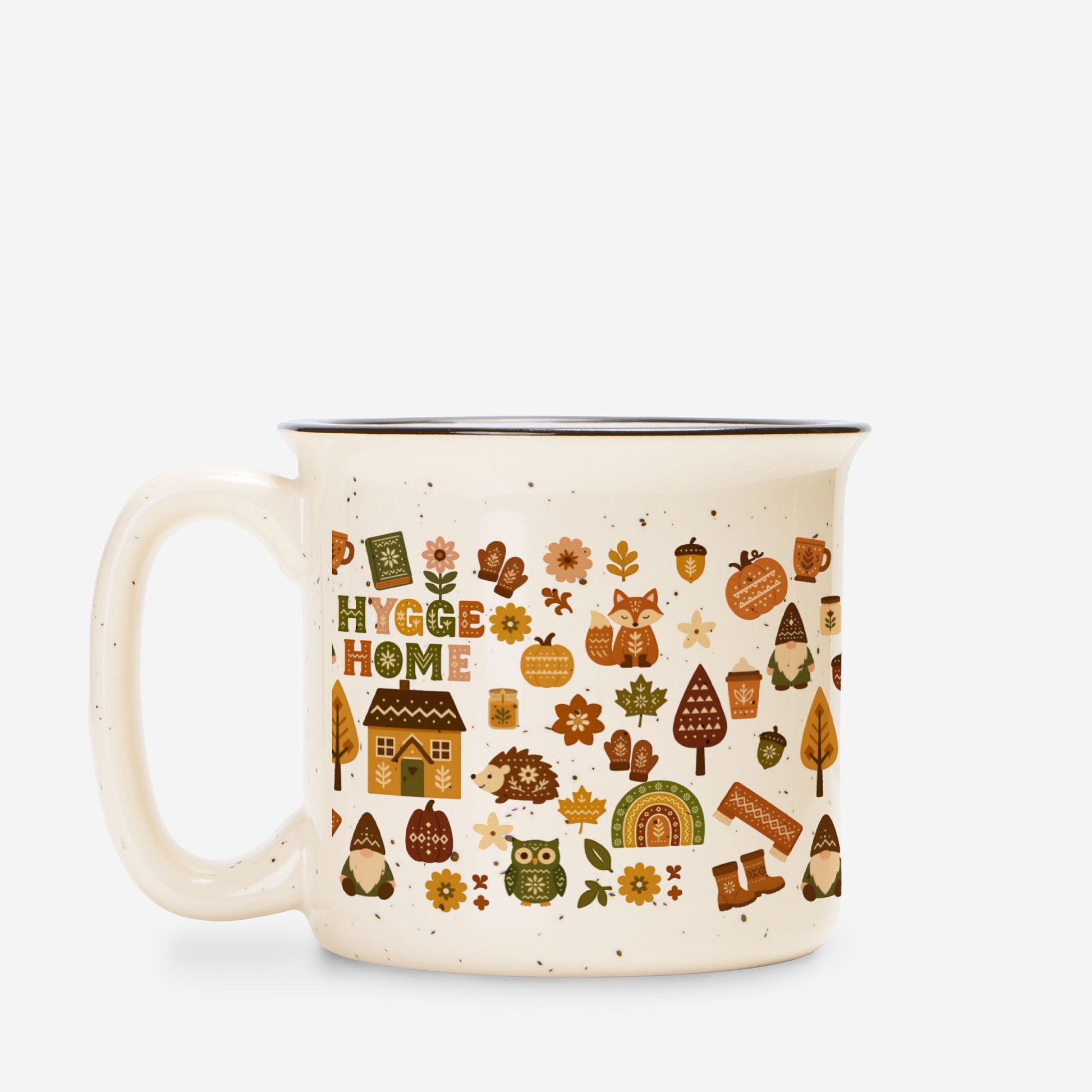 Trending hygge coffee mug! Perfect cozy campfire ceramic cup with Scandinavian home decor style. Ideal gift for coffee lovers. Rustic speckled design.