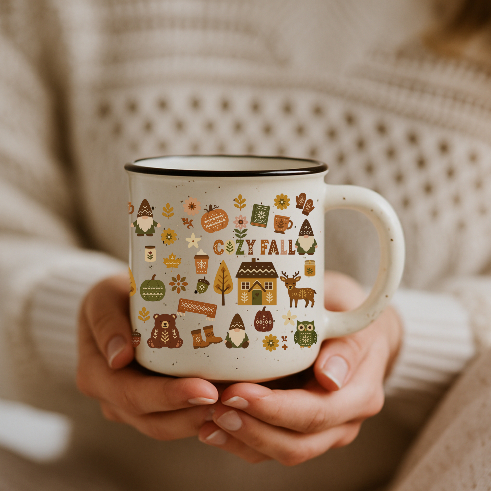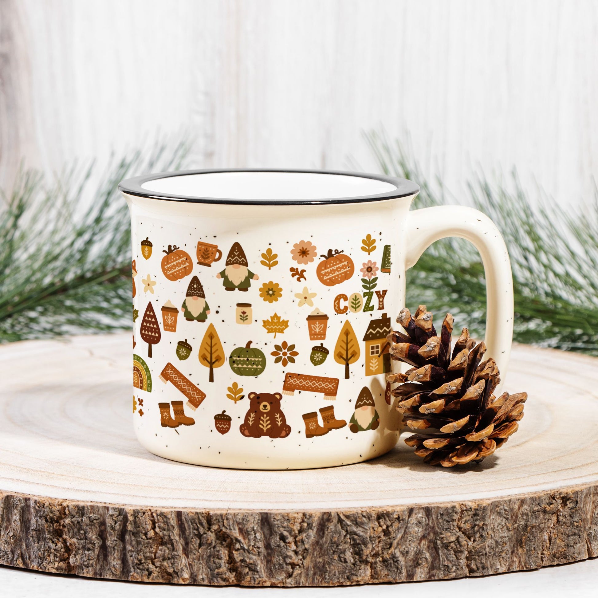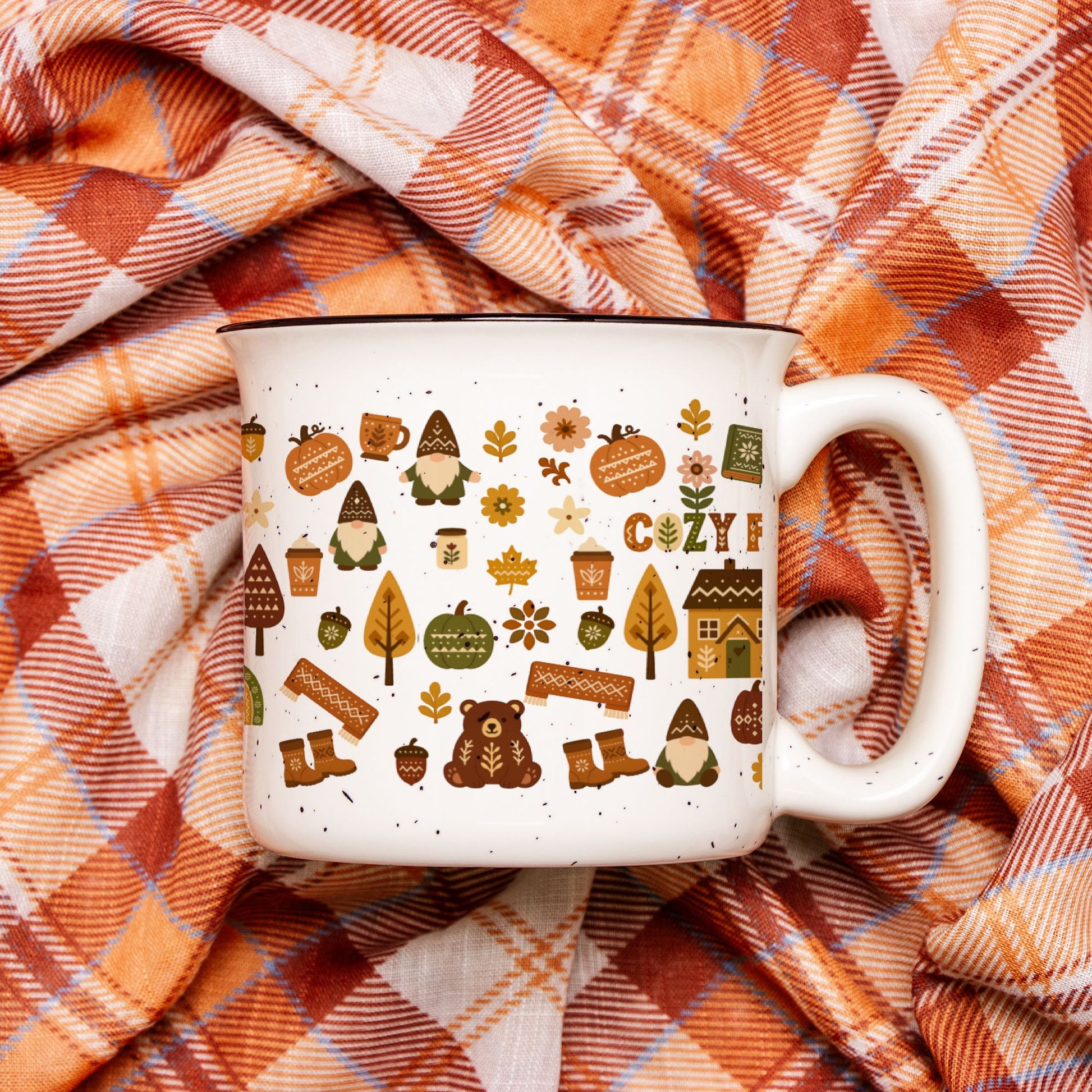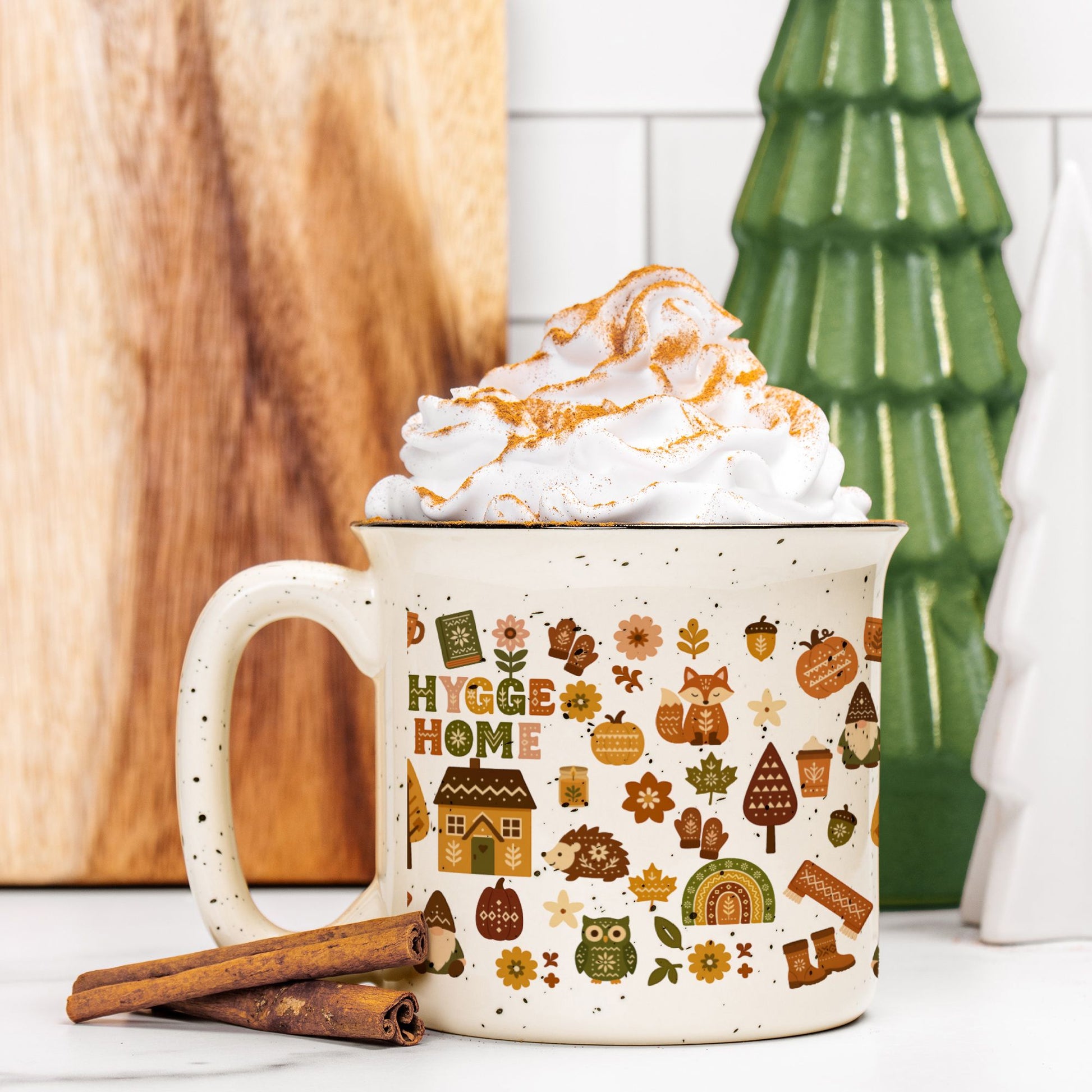 Trending hygge coffee mug! Perfect cozy campfire ceramic cup with Scandinavian home decor style. Ideal gift for coffee lovers. Rustic speckled design.