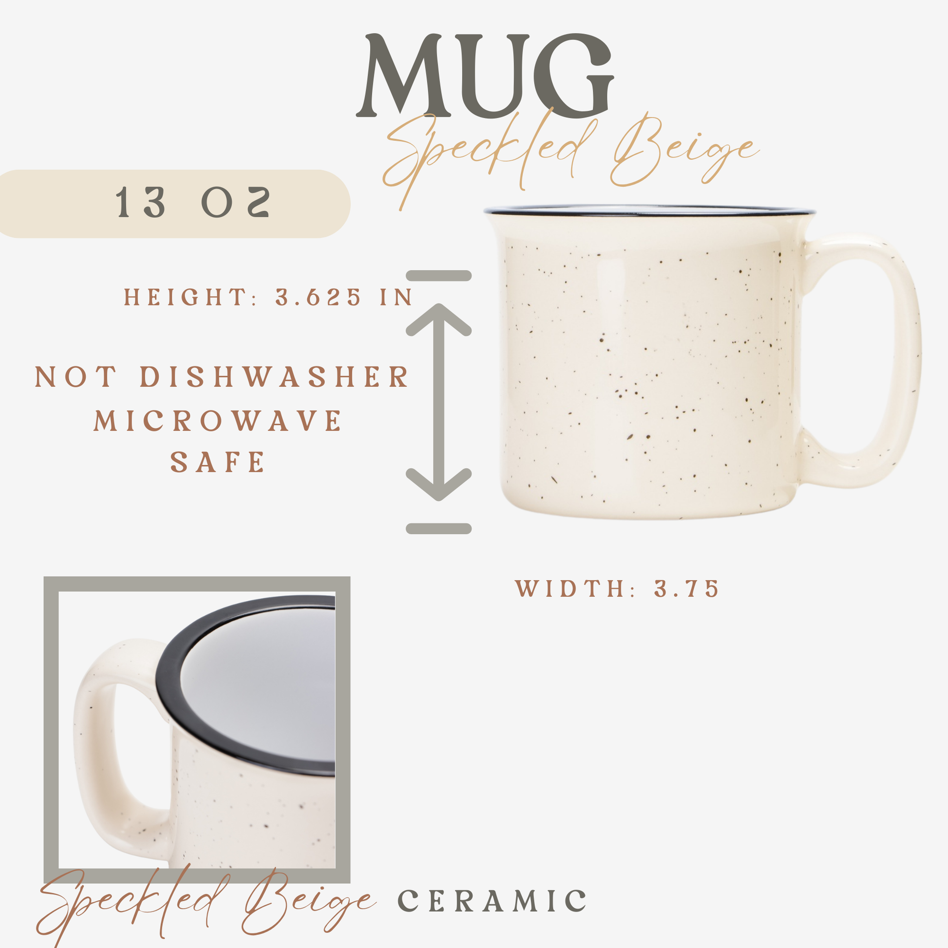 Material: Speckled Beige Ceramic with Black Rim