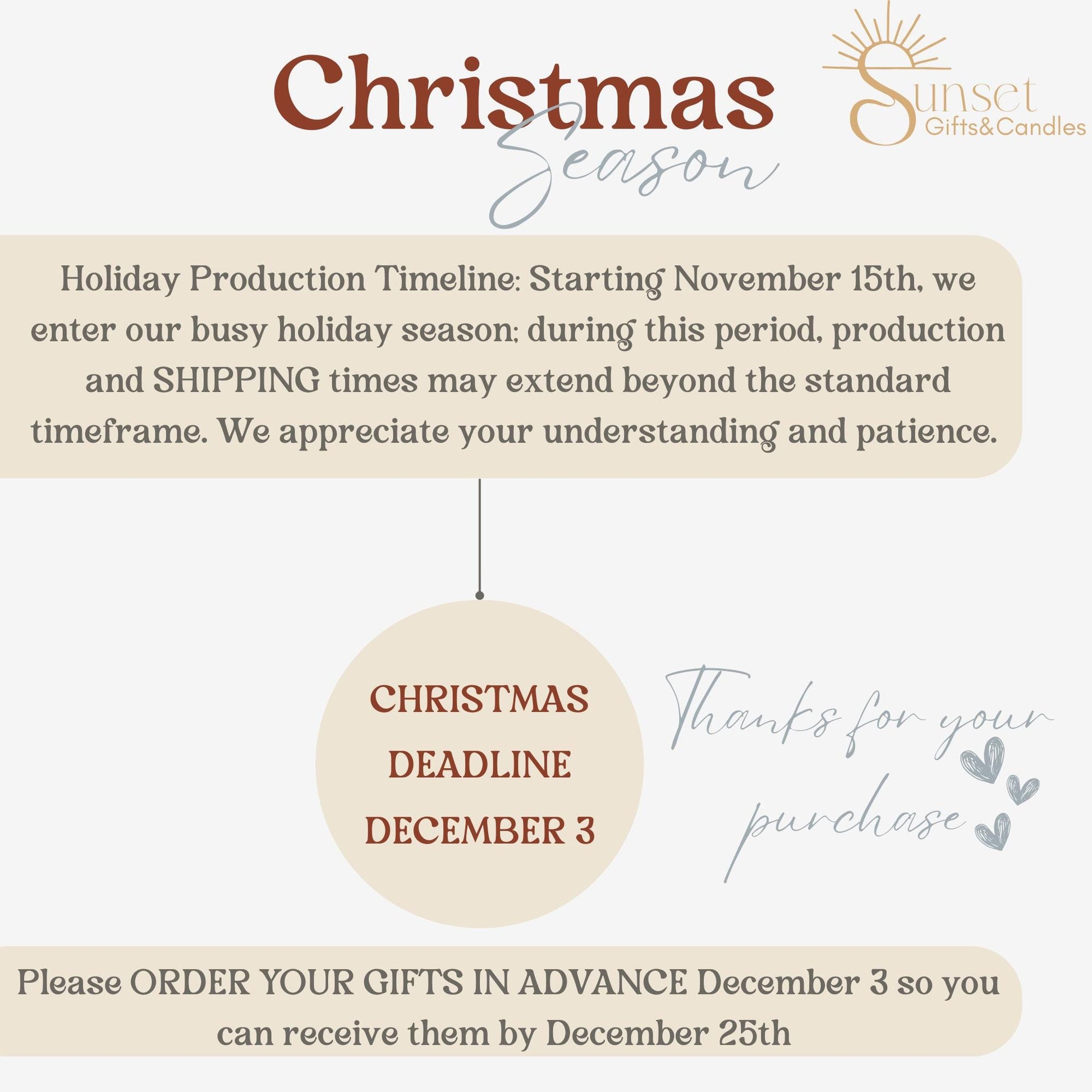 Custom orders typically take 3-5 business days to produce before shipping. During Holiday Season can be extended.
