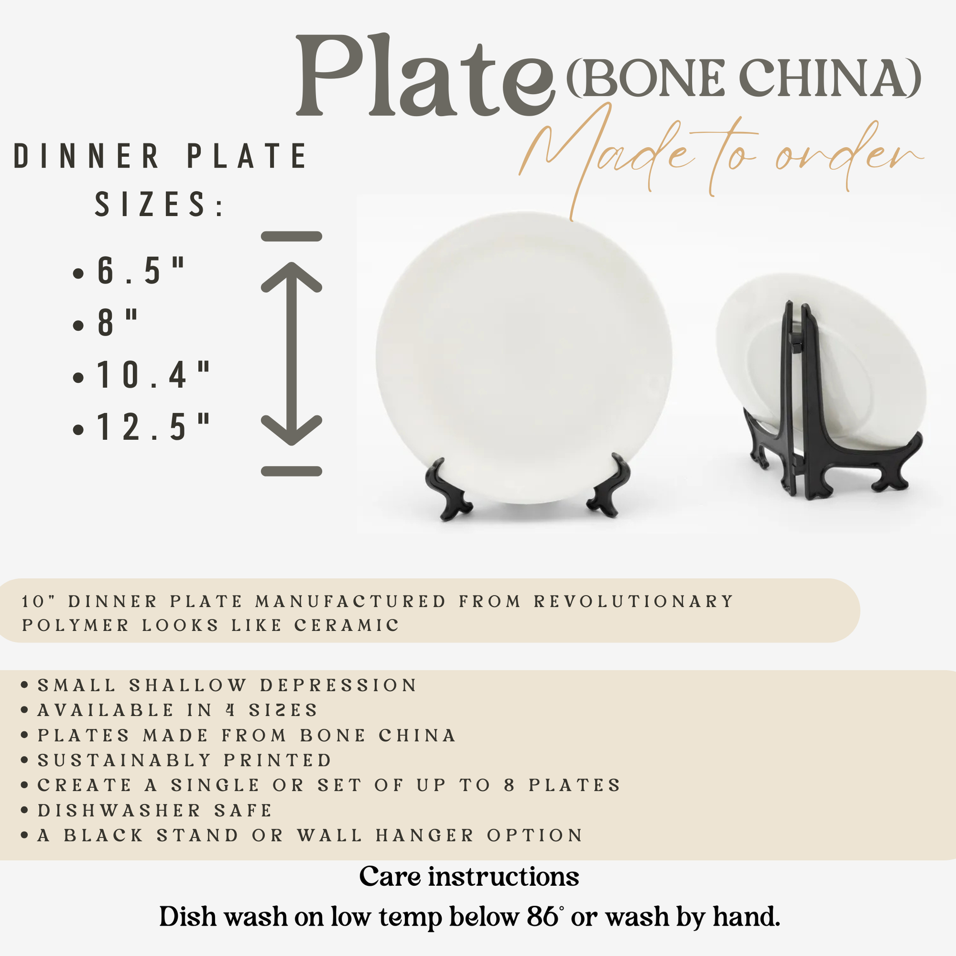 Made from solid and sturdy Bone china, your custom dinner plates are a thing of beauty. Available in three sizes: 16.5cm (6.5 inches), 20.5 cm (8 inches) or 26.3cm (10.3 inches) or 31.5cm (12.5 inches), customised dinner plates are handmade to order and printed with a specialist method that ensures a crisp and vibrant, long-lasting finish, easy to clean with a smooth, shiny surface.Create a single or set of up to 8 plates
