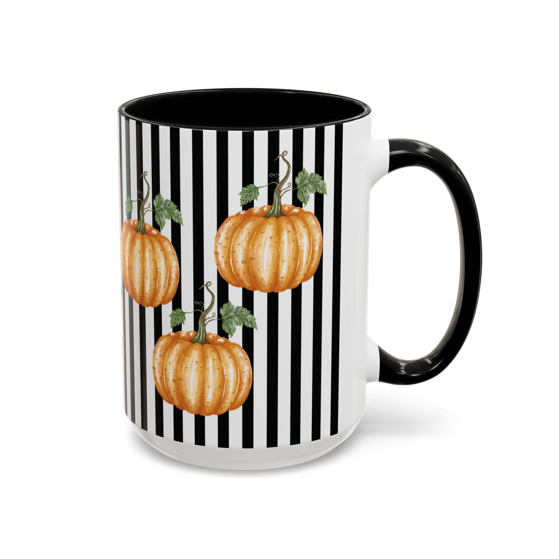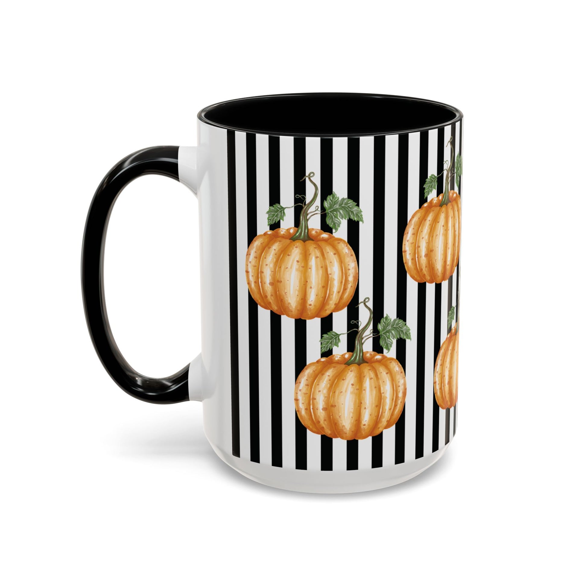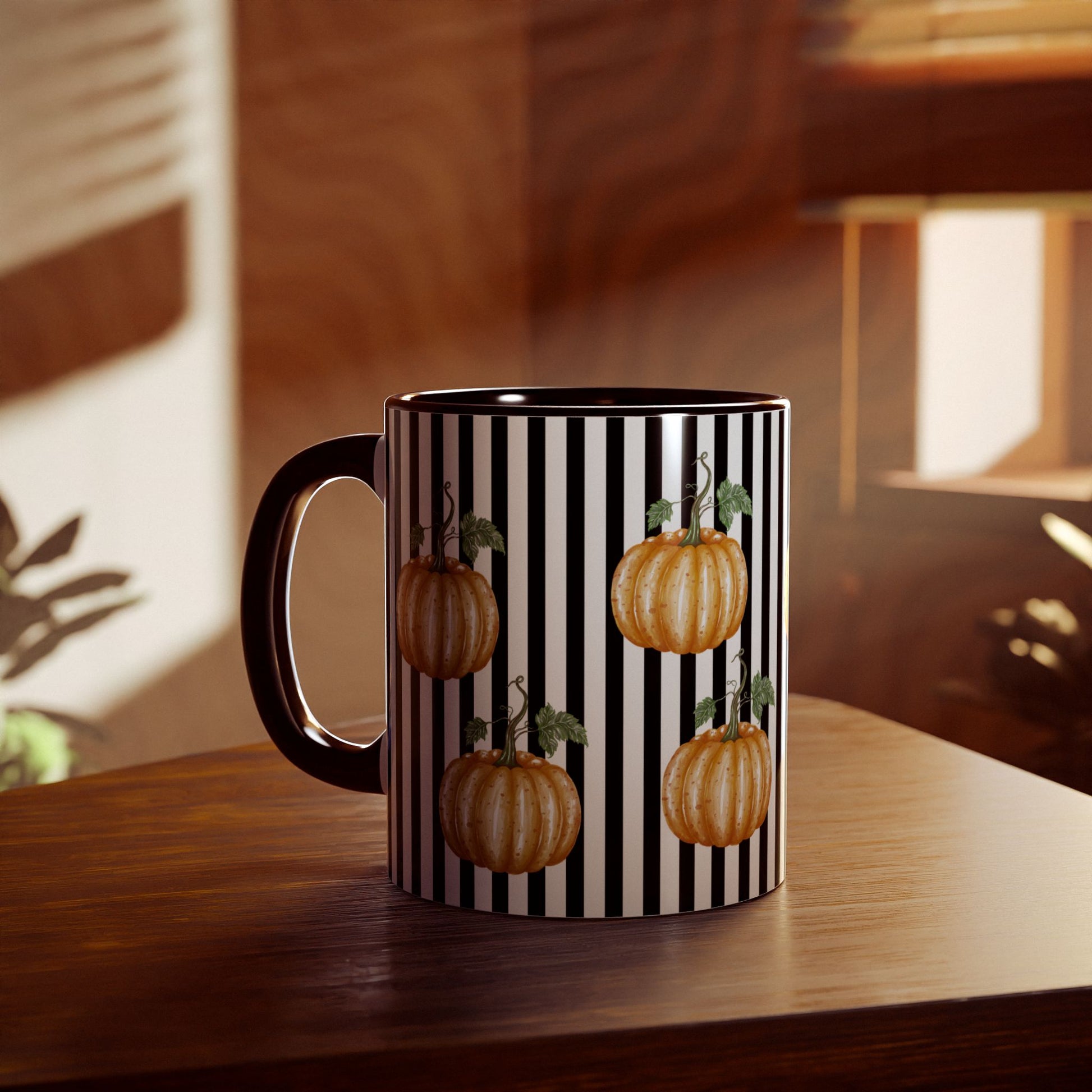 With its vibrant pumpkin design set against a classic black-and-white striped background, this mug adds a festive flair that's perfect for autumn gatherings or cozy holiday moments. This product is ideal for celebrating occasions like Halloween and Thanksgiving, making it a thoughtful gift for friends and family, or a delightful treat for yourself!