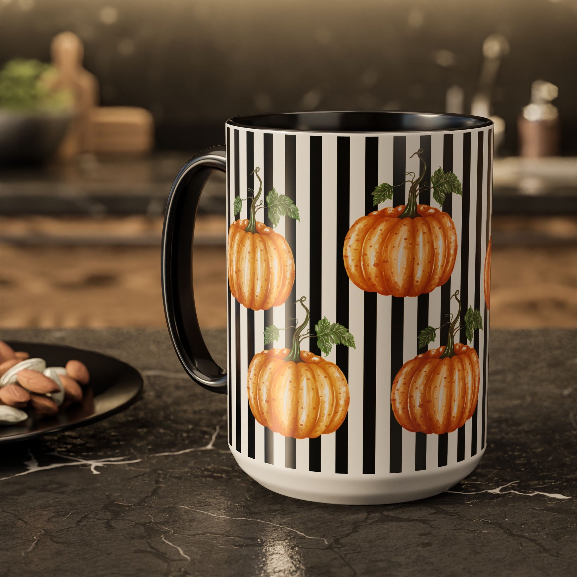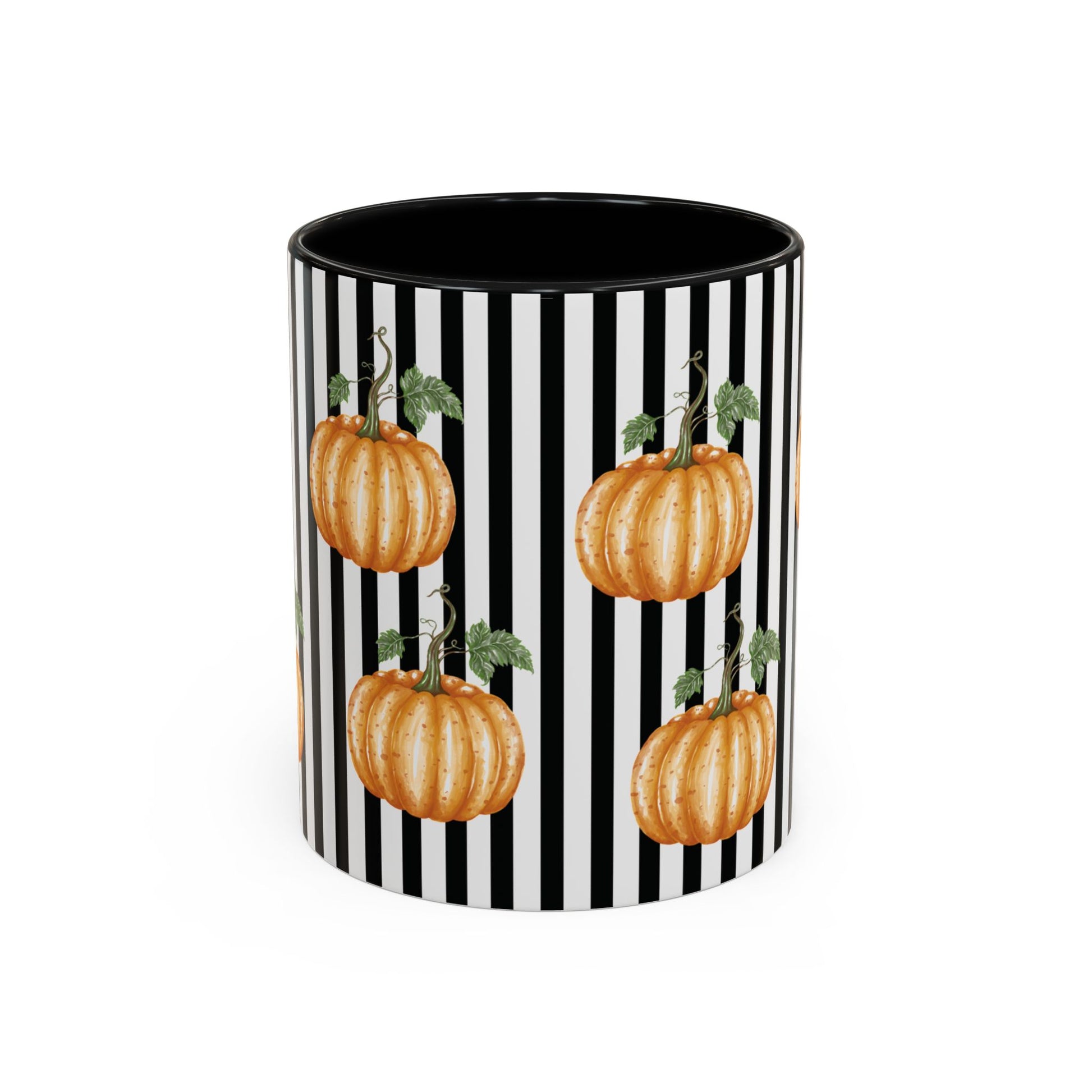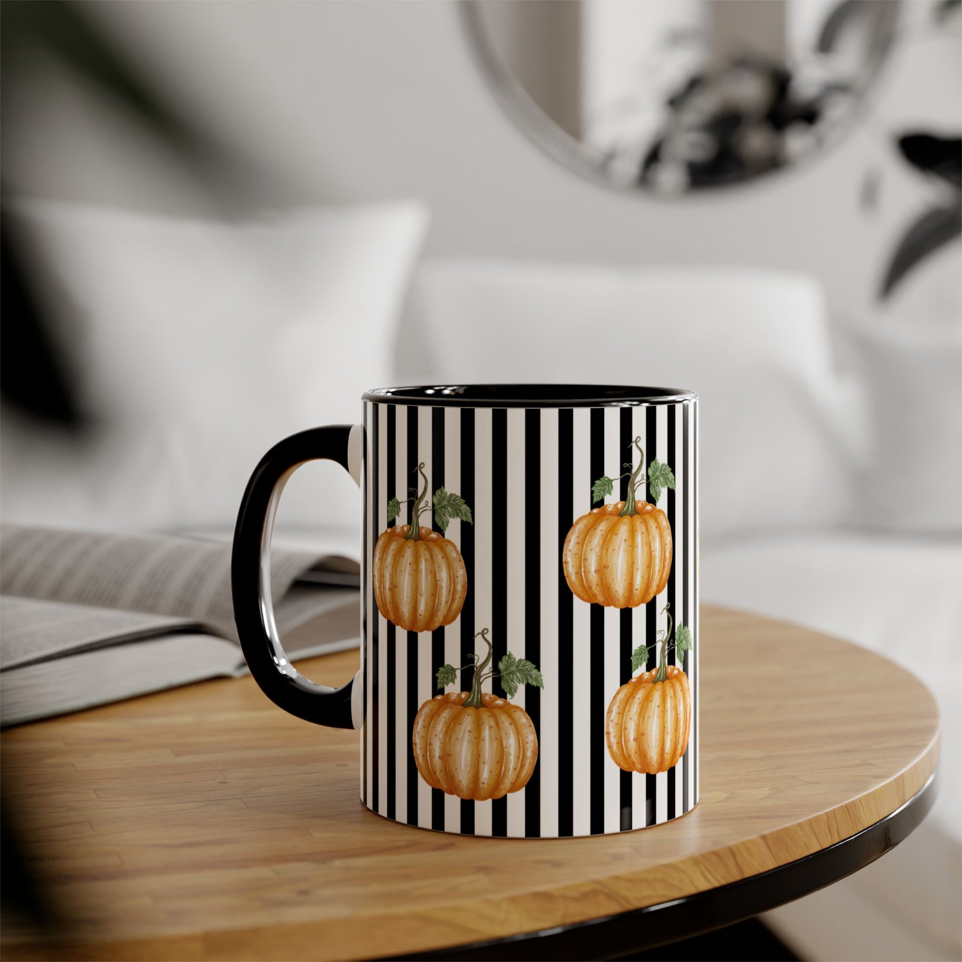 With its vibrant pumpkin design set against a classic black-and-white striped background, this mug adds a festive flair that's perfect for autumn gatherings or cozy holiday moments. This product is ideal for celebrating occasions like Halloween and Thanksgiving, making it a thoughtful gift for friends and family, or a delightful treat for yourself!