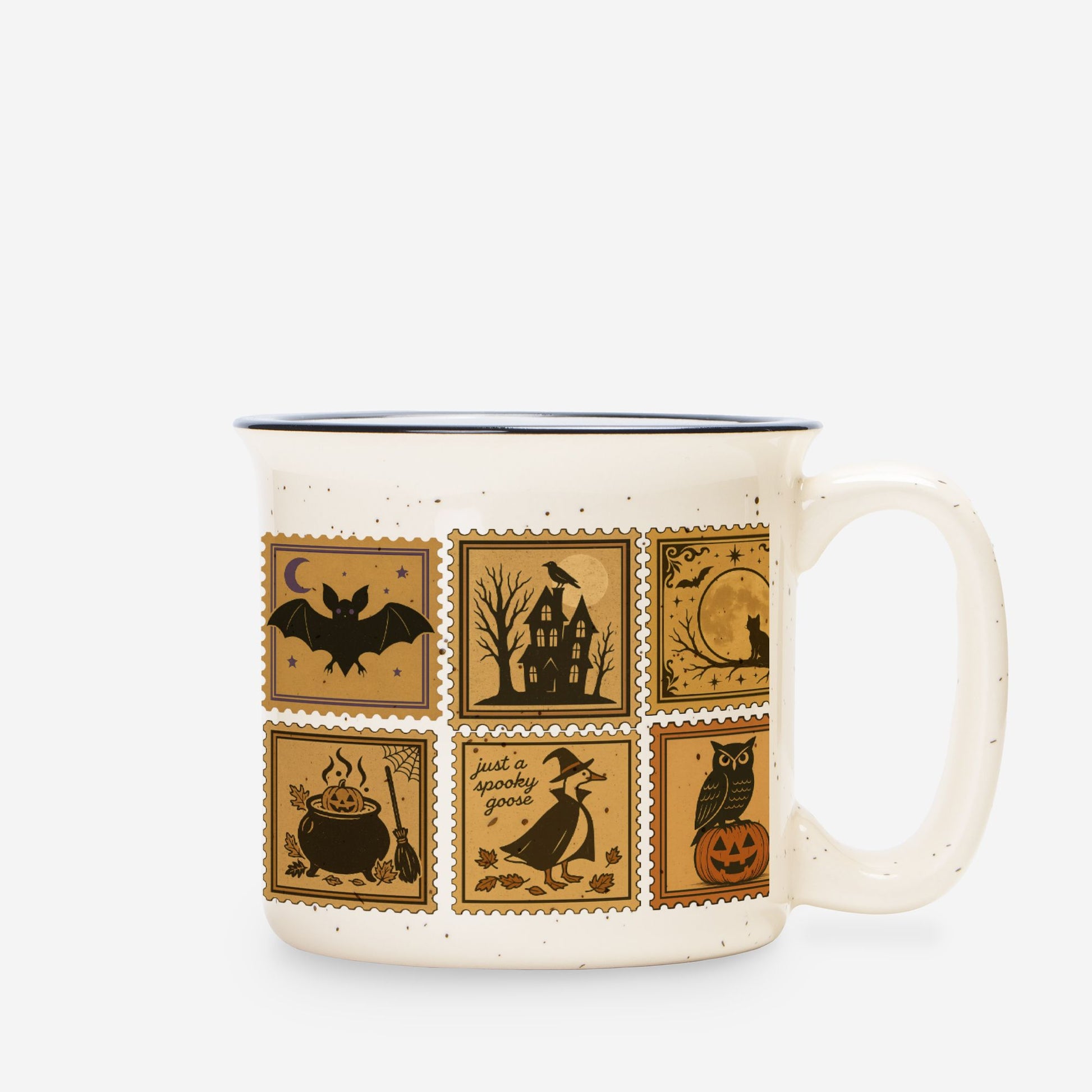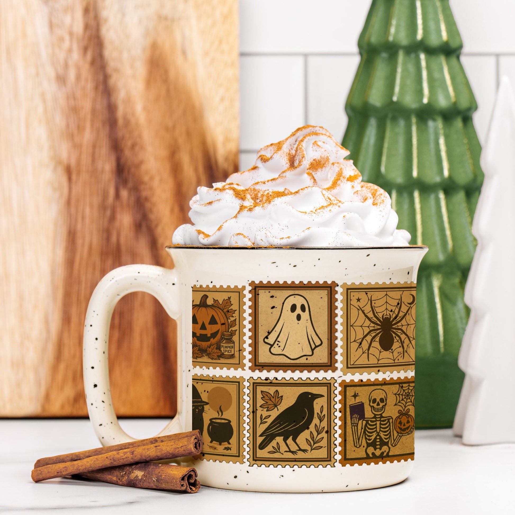 Cozy Fall Camping Mug with Halloween stamps design of cats, witch and ghost